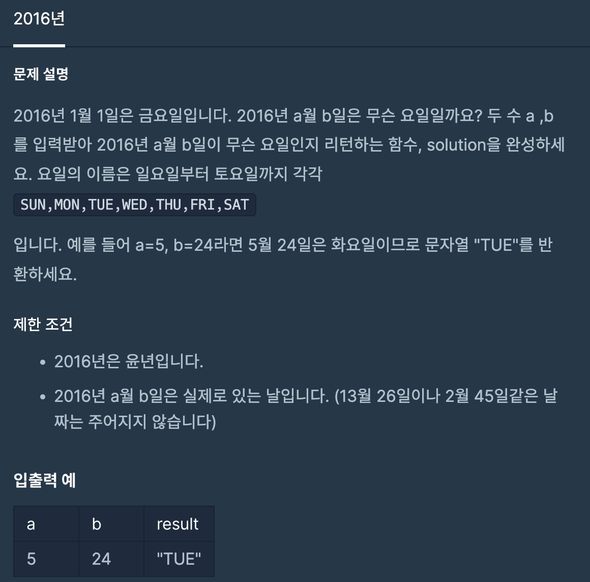 a의 앞 달까지 일수를 b 에다가 더해주고 7로 나눴을 때 남은 수를 String 배열의 인덱스로 놓아 답을 구해준다.