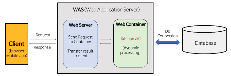 - WAS는 JSP, Servlet 구동 환경을 제공한다.